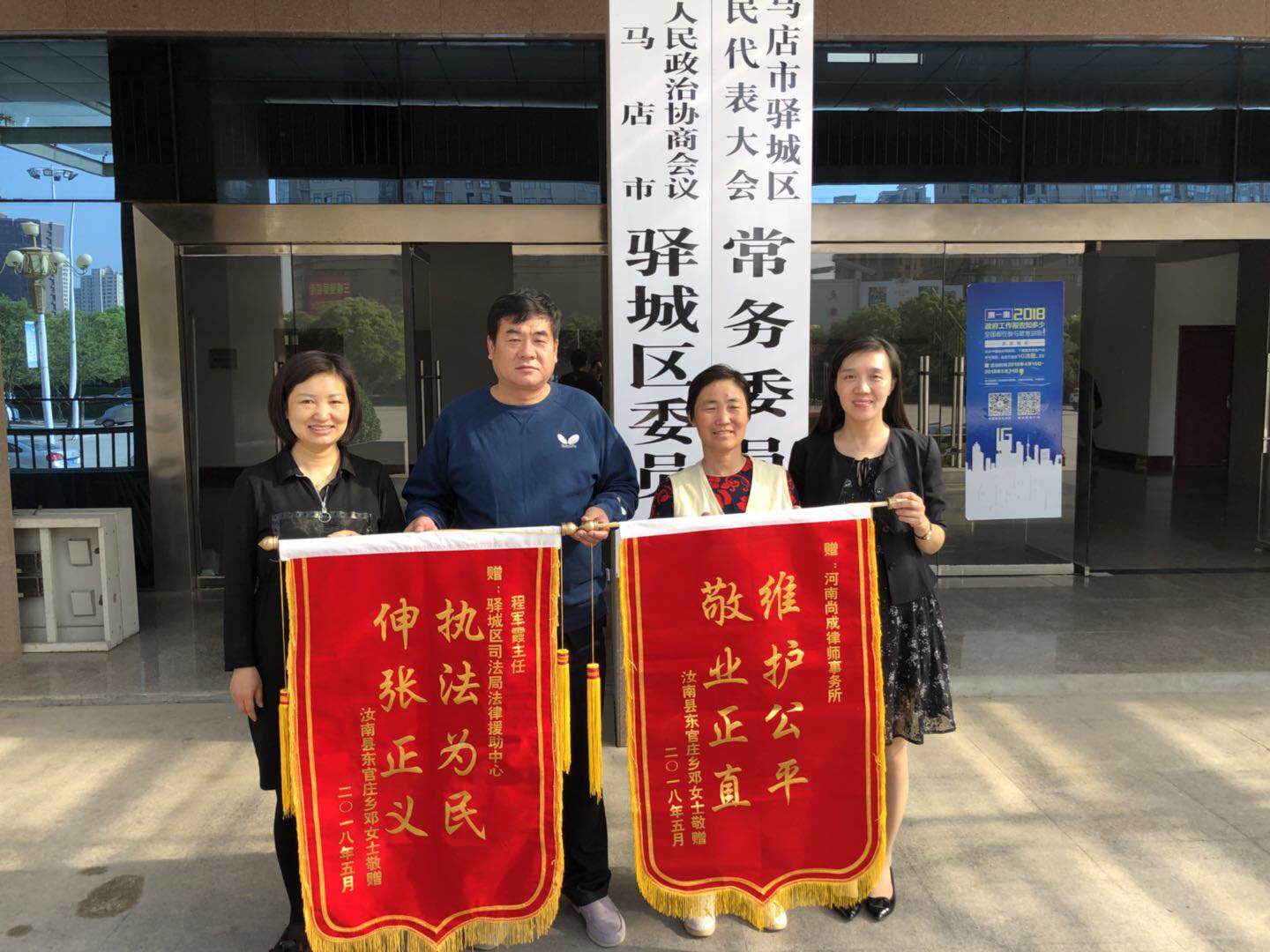 2018年5月4日上午,来自汝南县东官庄乡的邓女士一早就来到驿城区法律援助中心,对中心指派的律师及办案质量深表认可和感谢。特地送来两面锦旗,一面送给法援中心程主任,一面送给河南尚成律师事务所的张凤君律师。邓女士诚恳再三感谢区司法局及河南尚成律师事务所对她的帮助,感谢司法局领导积极为群众办实事、解难事!!