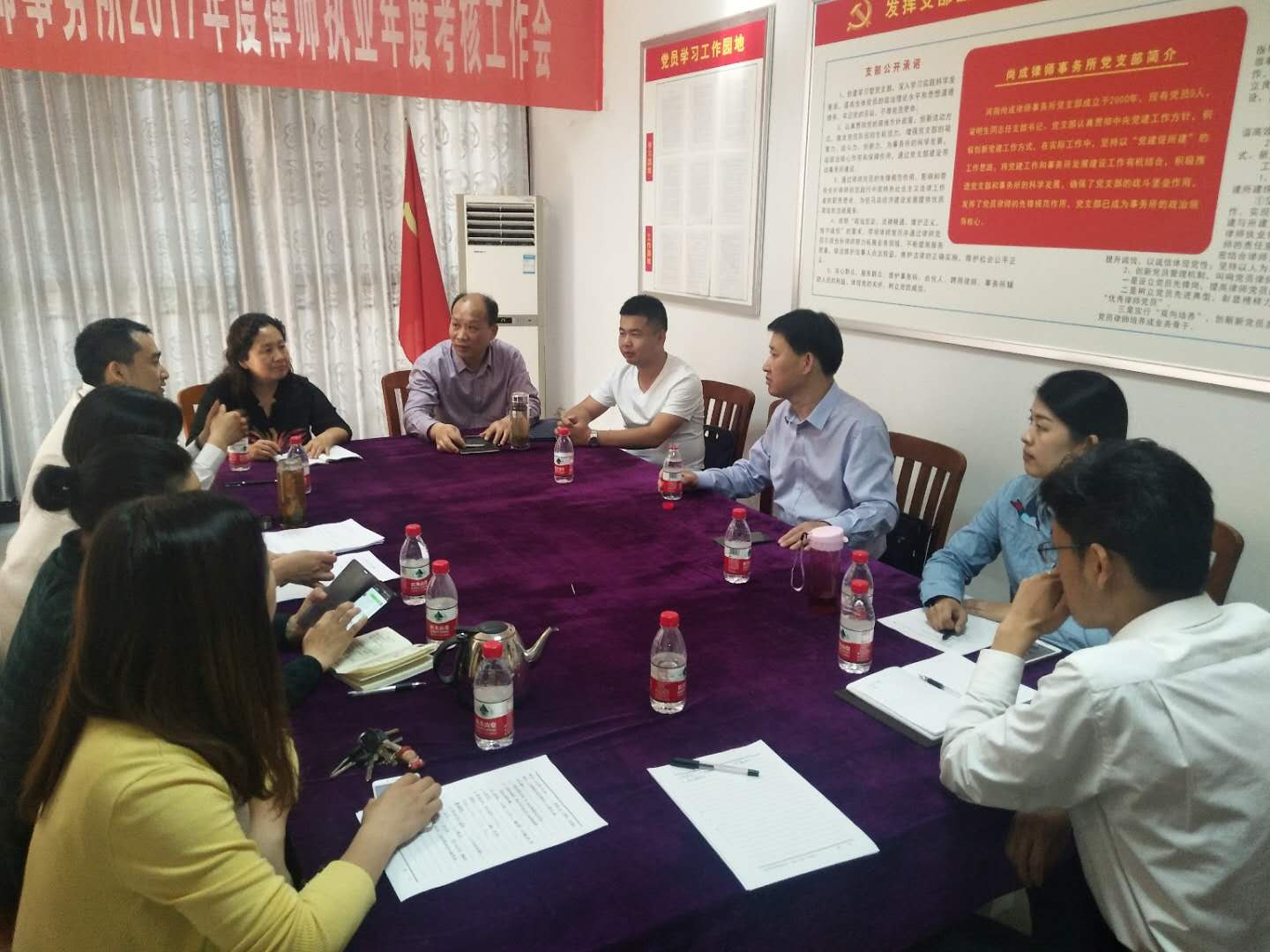 我所梁明升主任向各位领导的到来表示了感谢,权利华主任汇报了2017年河南尚成律师事务所队伍建设、业务培训、公益活动、党建工作、档案管理以及我所和律师在2017年所获得荣誉等情况。