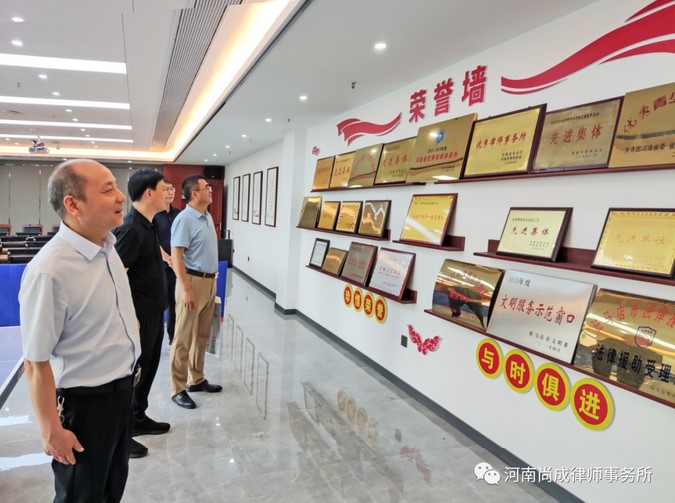 梁明生主任、王玉祥监事长等首先陪同祝向荣主任参观了尚成所律师办公室、行政办公室、财务办公室、党员活动室、多媒体综合会议室、荣誉墙等,祝向荣主任对尚成所宽敞明亮的办公场所、优美的办公环境,尤其是标准化党员活动室、尚成所荣誉墙等大加赞赏。