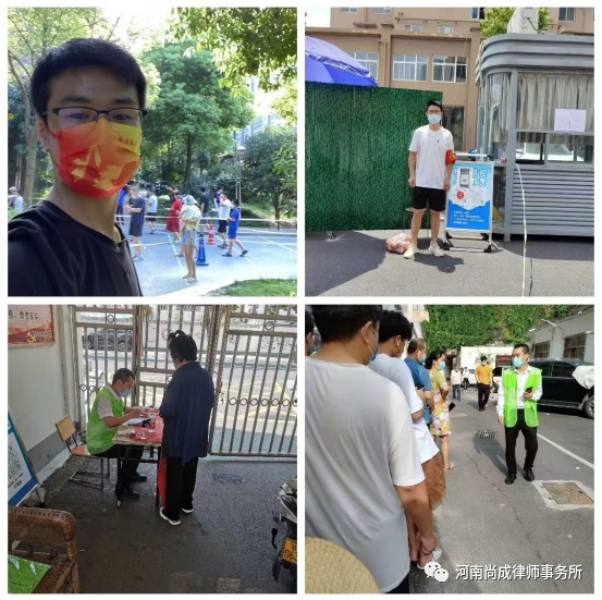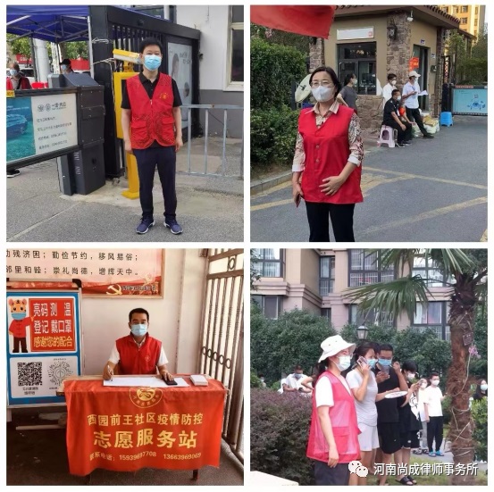 近日,新冠肺炎疫情波及我市,疫情防控形势严峻复杂。7月13日至7月18日,市中心城区实行临时管控措施。河南尚成律师事务所积极响应疫情防控工作的部署,按照市司法局、市律师行业党委的要求,积极落实“双报到”政策,勇于担当社会责任,积极参与疫情防控,多名党员律师参加了志愿者服务活动,践行“人民律师为人民”的责任与担当。