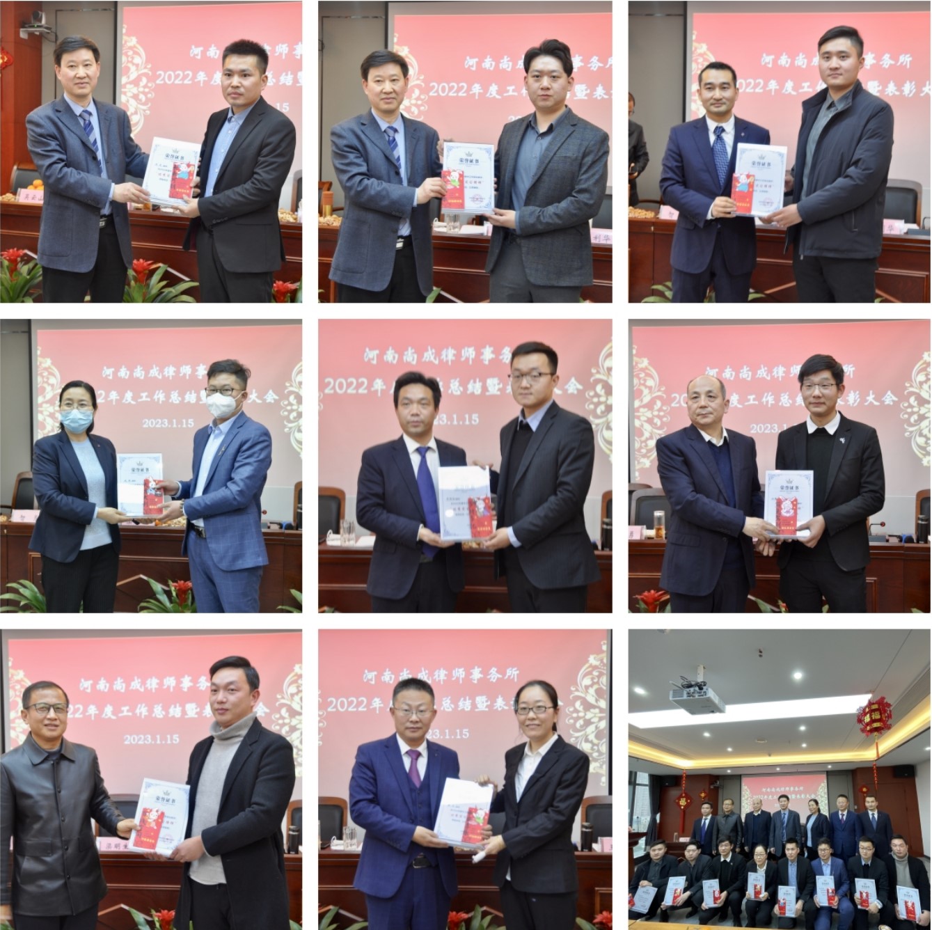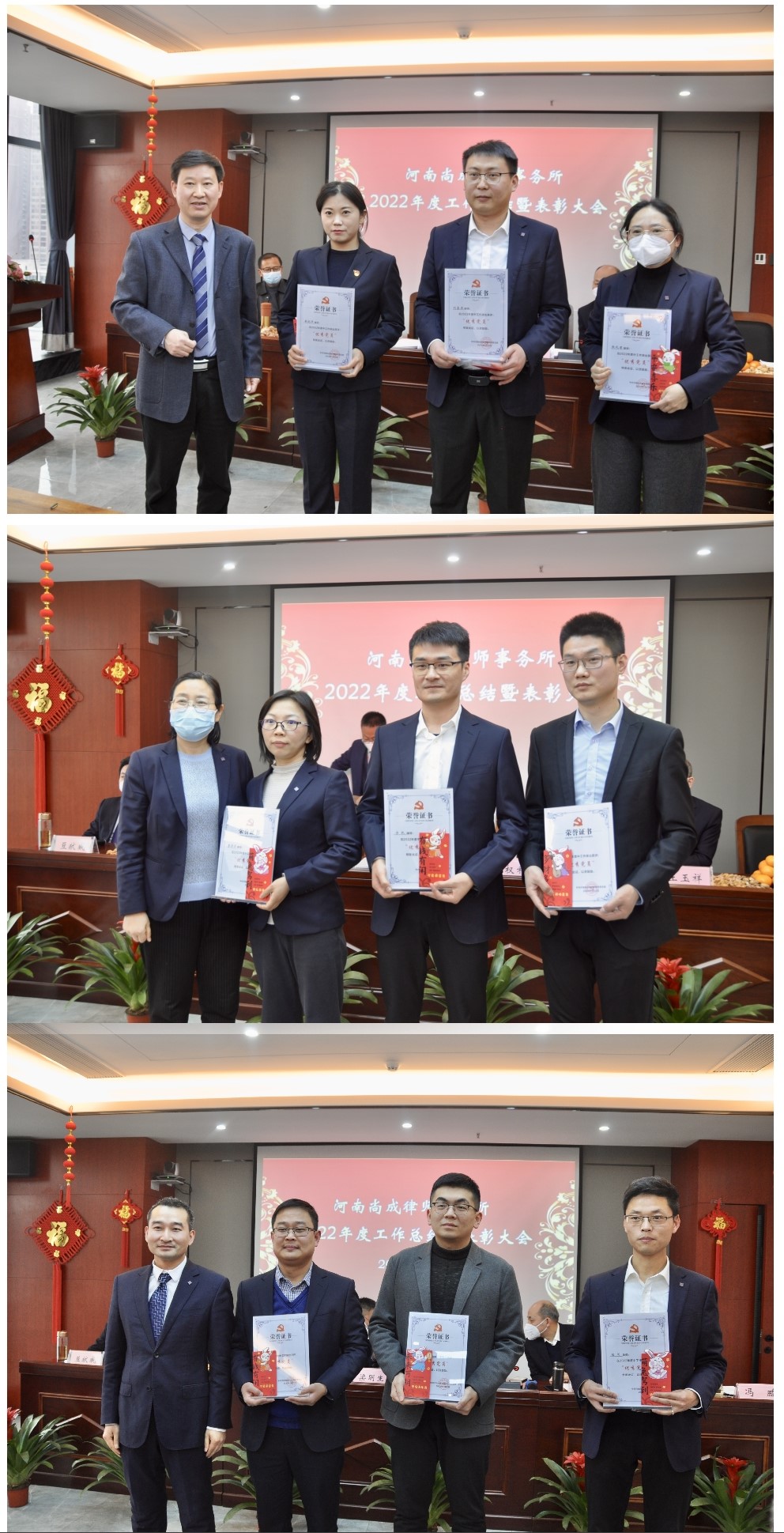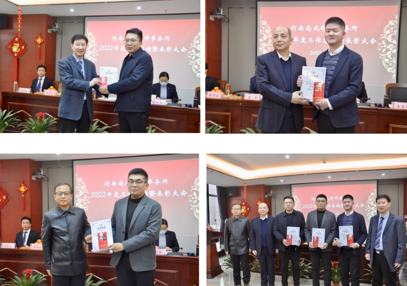 随之,监事长王玉祥宣读了《河南尚成律师事务所关于表彰2022年度先进个人的决定》,律师赵志鹏、曹操、罗莹荣获“优秀律师”称号;律师宁凯、李艳萍、张凤君荣获“办案能手”称号;律师李艳萍、罗莹、李莎莎、黄晓沛、陆闯荣获“公益标兵”称号;律师臧奕威、王顺友、苗博然荣获“新星奖”称号;实习律师梁豪、潘世豪、李毅、赵保、律国朝、田耀武、张孝臣、张冉荣获“优秀实习律师”称号;行管财务人员张立功、马天驰、陈全福荣获“优秀行管、财务人员”称号。与会领导分别为受表彰者现场颁发了奖杯、奖金、荣誉证书。