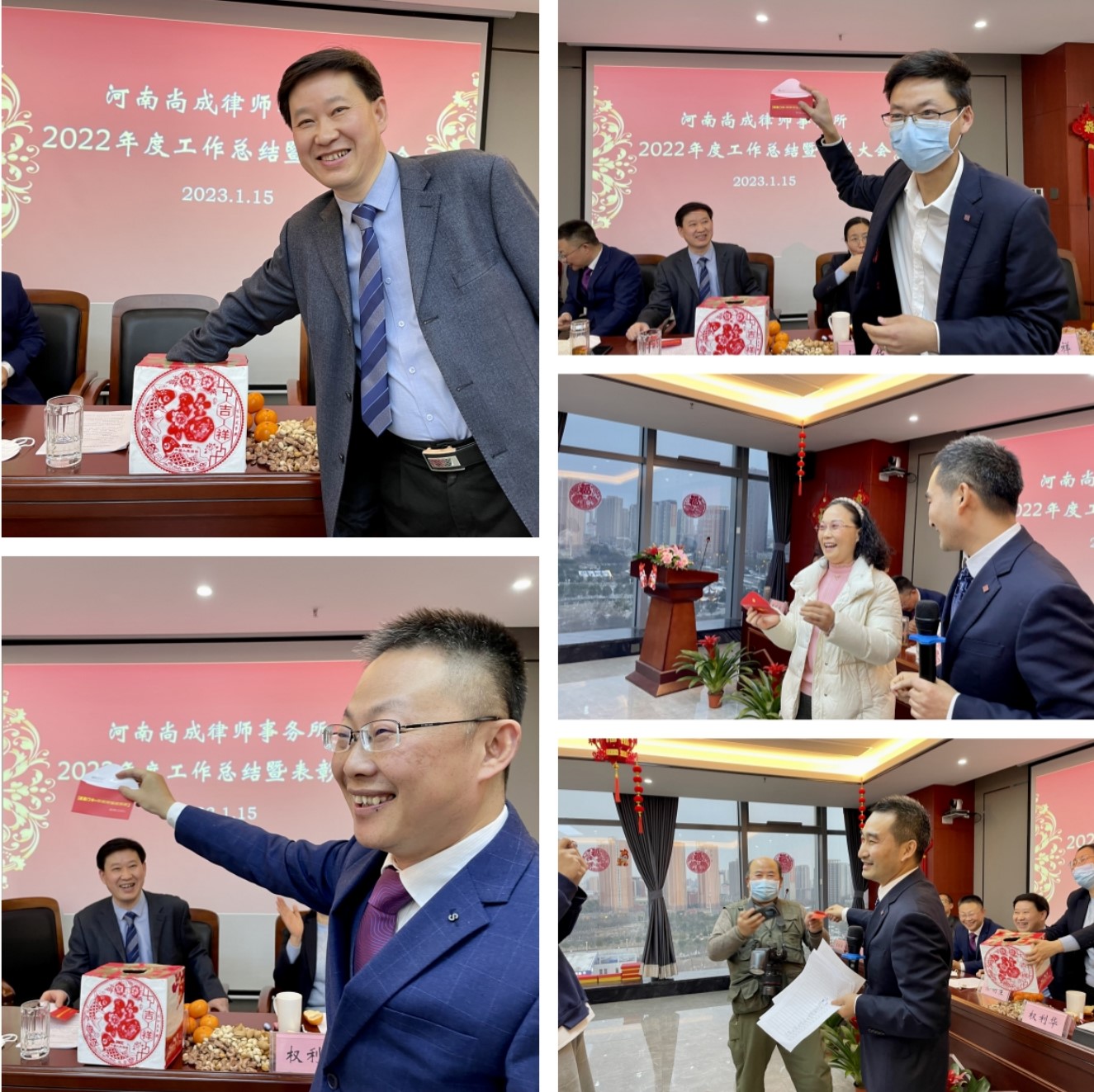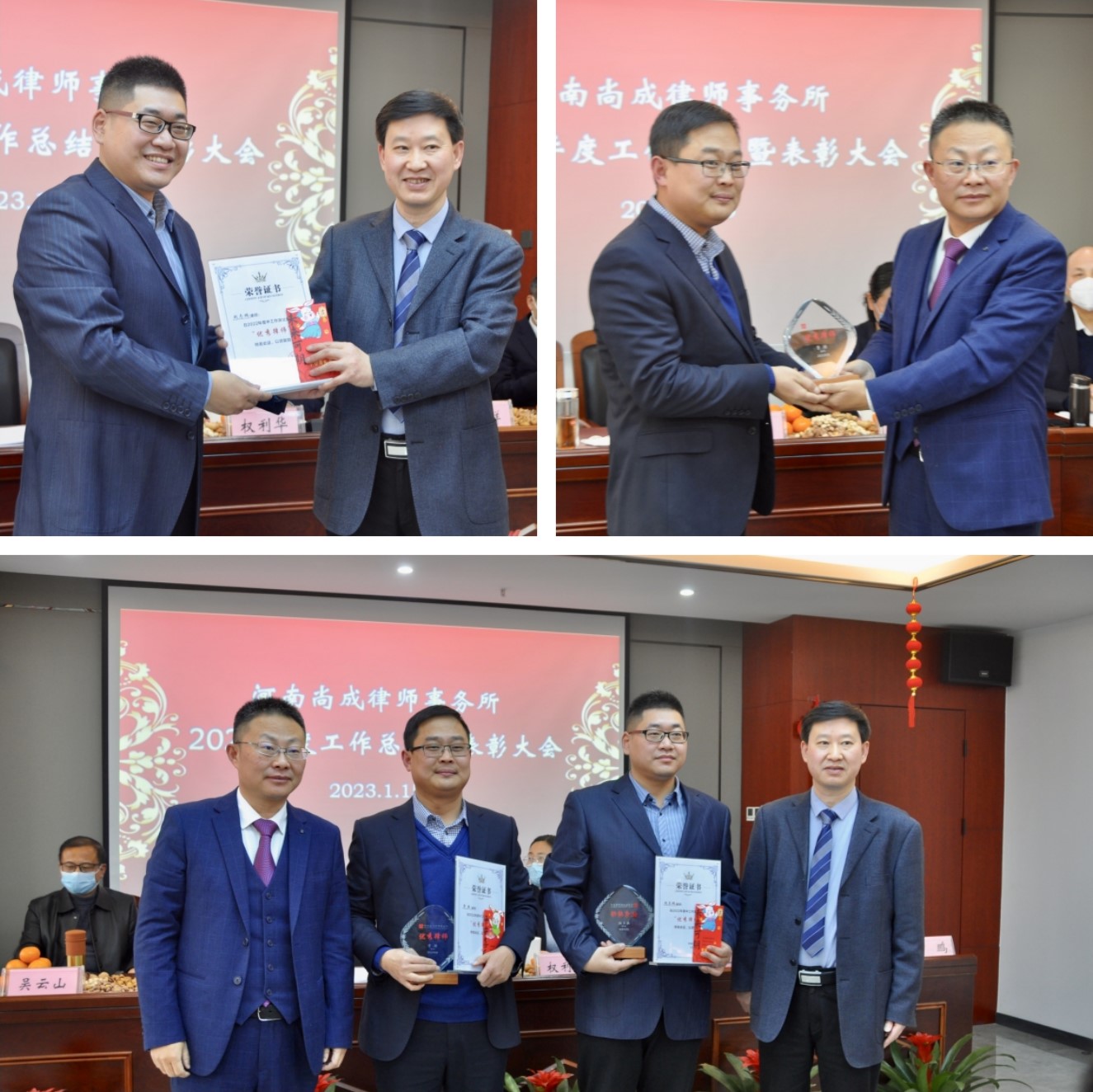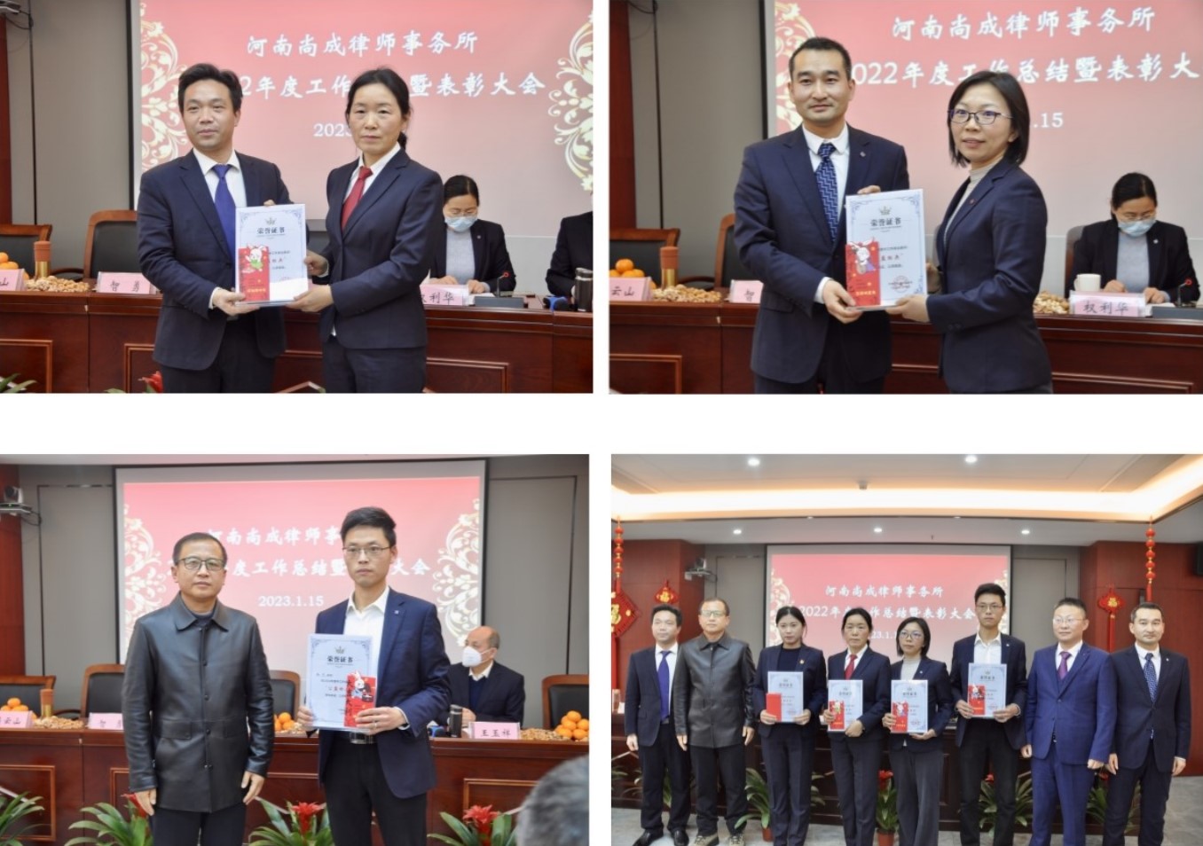 随之,监事长王玉祥宣读了《河南尚成律师事务所关于表彰2022年度先进个人的决定》,律师赵志鹏、曹操、罗莹荣获“优秀律师”称号;律师宁凯、李艳萍、张凤君荣获“办案能手”称号;律师李艳萍、罗莹、李莎莎、黄晓沛、陆闯荣获“公益标兵”称号;律师臧奕威、王顺友、苗博然荣获“新星奖”称号;实习律师梁豪、潘世豪、李毅、赵保、律国朝、田耀武、张孝臣、张冉荣获“优秀实习律师”称号;行管财务人员张立功、马天驰、陈全福荣获“优秀行管、财务人员”称号。与会领导分别为受表彰者现场颁发了奖杯、奖金、荣誉证书。