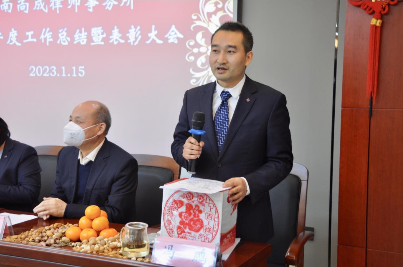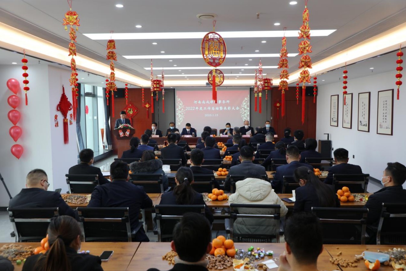 【天中商界讯】(朱剑锋 邓青 冯鹏 张凯航 )送金虎喜迎玉兔,辞旧岁恭贺新年。1月15日,值辞旧迎新,万象更新之际,河南尚成律师事务所在驻马店市置地国际广场一号楼八楼本所多功能会议室,隆重召开2022年度工作总结暨表彰大会。河南尚成律师事务所党支部书记、主任梁明生,执行主任权利华,副主任智勇,监事长王玉祥;副监事长吴云山;合伙人豆献威;合伙人冯鹏等领导班子成员以及河南尚成律师事务所全体同仁欢聚一堂,总结回顾过去一年取得的成绩,表彰辛勤付出的优秀同仁,为新一年的发展积蓄奋进力量。会议由执行主任权利华主持。